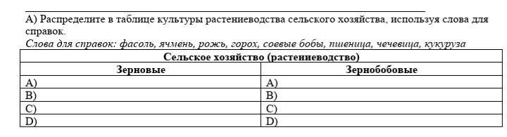 Ответ:зерновые:ячмень рожь пшеница кукуруза сорян лень ставить запятые остальное все в зернобобовые