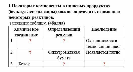некоторые компоненты в пищевых продуктах (белки, углеводы, жиры) можно определить с помощью некоторых реактивов Заполните таблицу