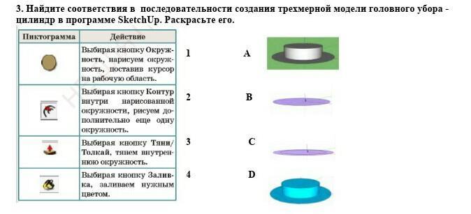 3. Найдите соответствия в последовательности создания трехмерной модели головного убора -цилиндр в программе SketchUp. Раскрасьте его.