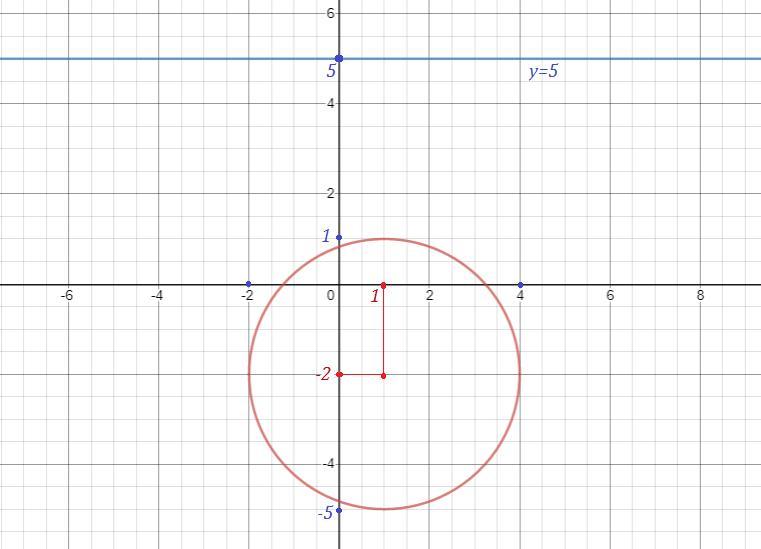 Прямая у=5 и окружность не имеют общих точек, не пересекаются.