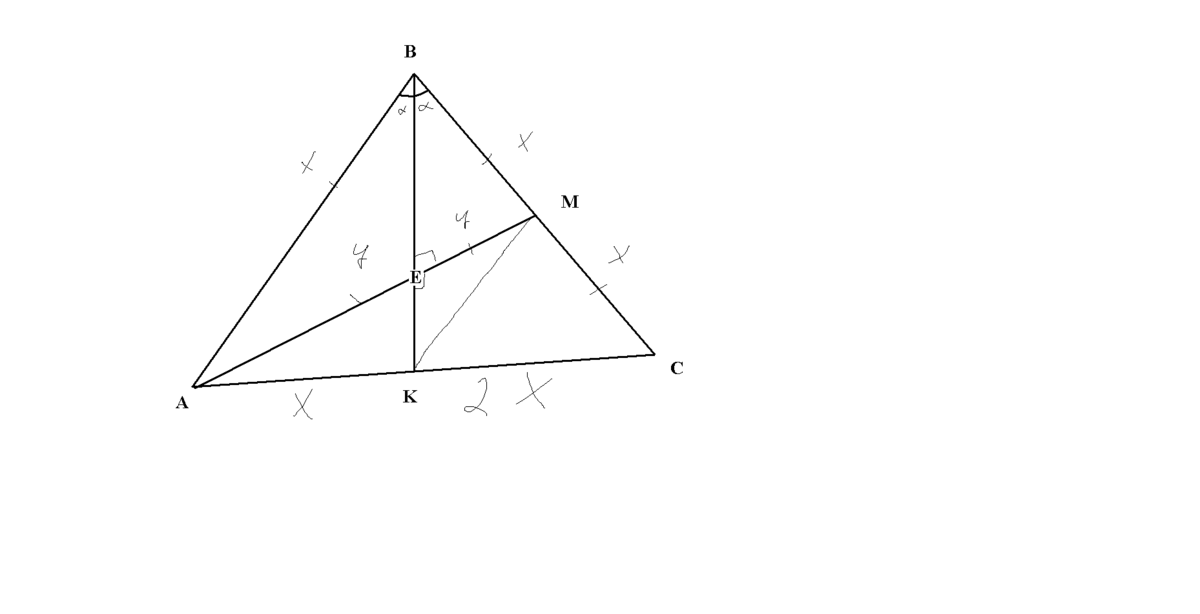 Нужно заметить то что треугольник АВM равнобедренный, потому что угол BEM = 90гр , и BE биссектриса, а это возможно в равнобедренном треугольнике ⇒ значит BM=AB ⇒ AE=EM. По свойству биссектрисы