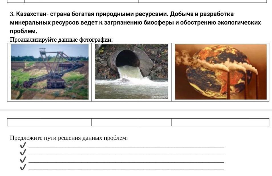 3. Казахстан- страна богатая природными ресурсами. Добыча и разработка минеральных ресурсов ведет к загрязнению биосферы и обострению экологических проблем.