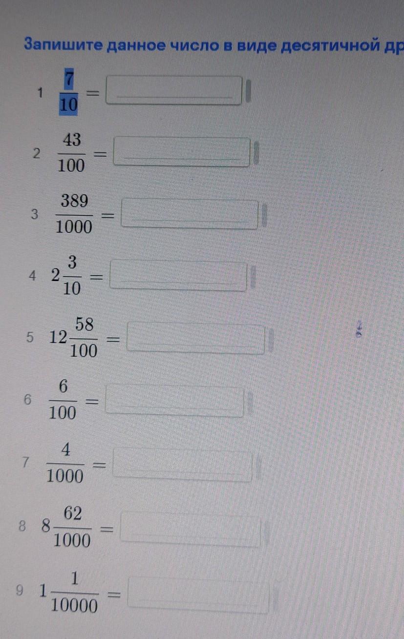 Ответ:0,7; 0,43; 0,389; 2,3; 12,58; 0,06; 0,004; 8,062; 1,0001.