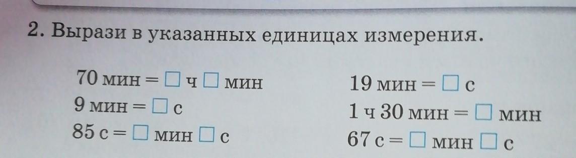 Ответ:70мин=1 час 10 мин 9 минут =90 секунд 85 секунд=1 мин 25 сёк 19 мин=190 сёк 1ч 30 мин=90минут 67 секунд =1 мин 7 сек