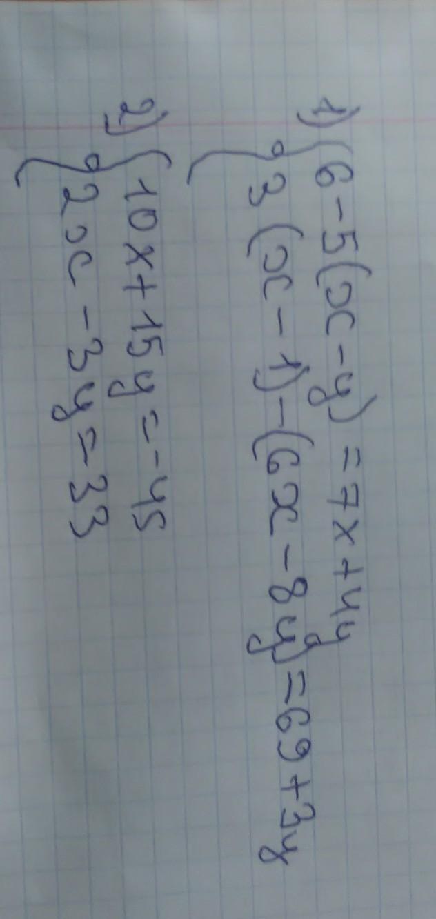 1)фигурная скобка 6-5(х-у)= 7х+4у и 3(х+1)-(6х+8у)=69+3у 2)фигурная скобка х/2-у/3=2 и 5х-у=34