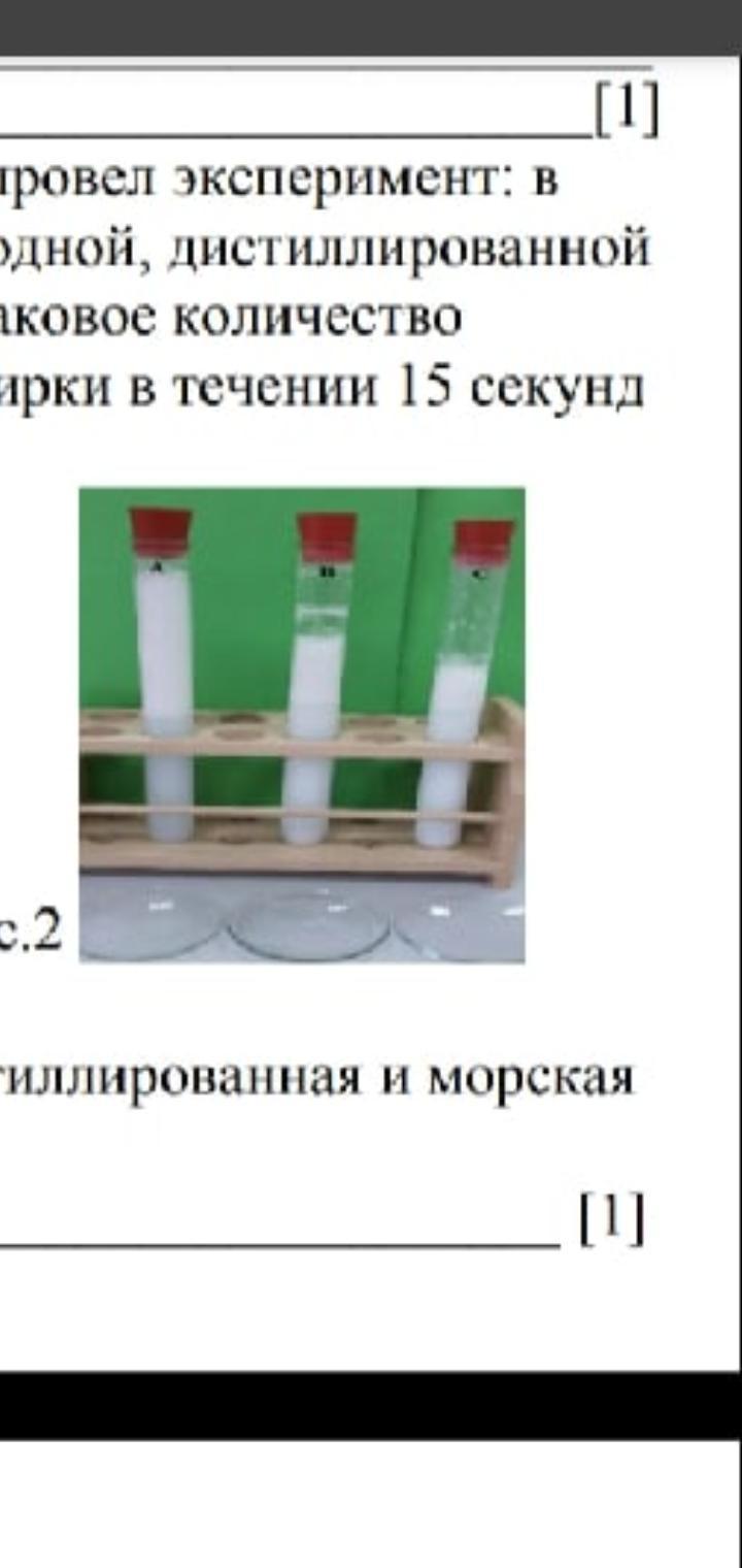 для определения жесткости воды ученик провел эксперимент в трех колбах находится по 20 мл водопроводной, дистиллированной и морской воды. в каждую он поместил одинаковые количество стирального порошка и встряхнул пробирки в течении 15 секунд. определите в какой пробирке морская и дистиллированная вода