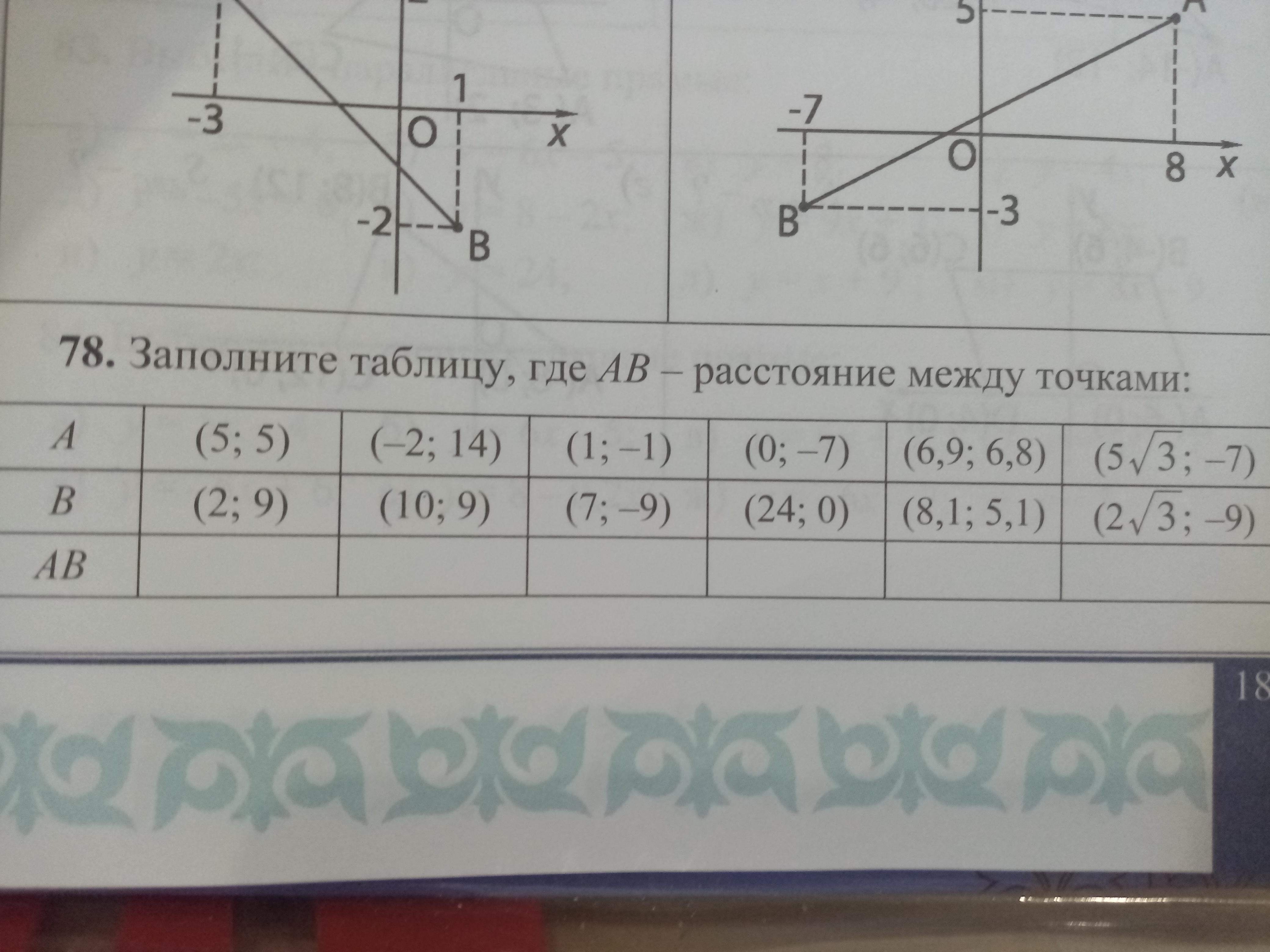 Заполните таблицу, где АВ расстояние между точками. Помогите пж, буду благодарна. ❤️