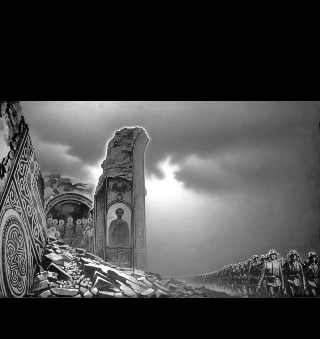 Параллельно колонне солдат мы видим развалины церкви или храма. Это видно по знакам, иконам, фрескам. На еще не совсем обрушено стене видно большую икону святых, которые смотрят вслед солдатам и молятся за народ, подвергнувшийся таким страданиям. В контрастности двух этих событий видно, что где бы ни прошел враг, там всегда развалины, гибель и слезы.