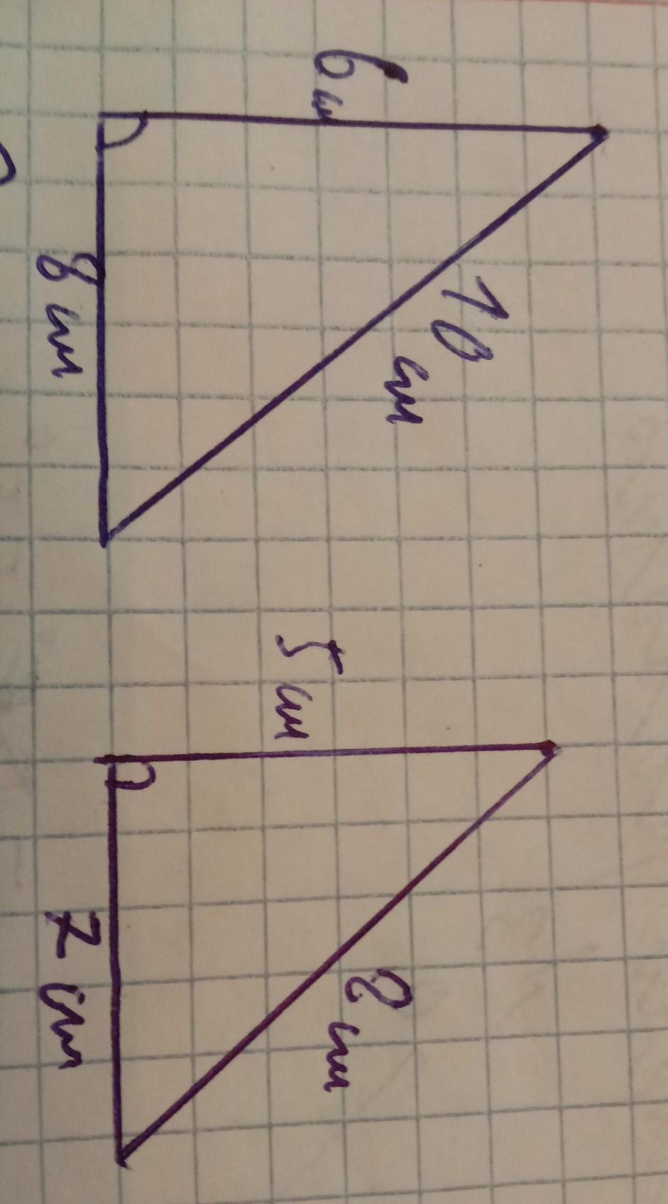 1) Построй прямоугольные треугольники со сторонами, прилегающими к прямому углу: 6см и 8см; 5см и 7см. Найди площади треугольников.