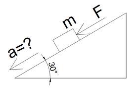 Определите ускорение с которым тело будет спускаться. Коэффициент свободного падения принять равным 9.8 м/с2. Коэффициент трения принять равным 0.1. При этом F = 5 H. Масса тела 3 кг. (см. Рисунок)