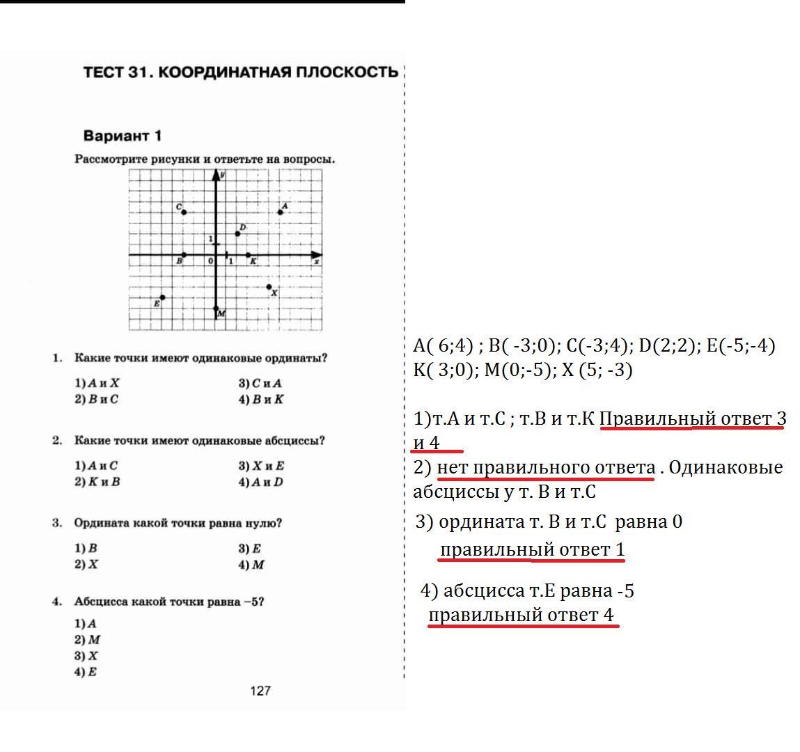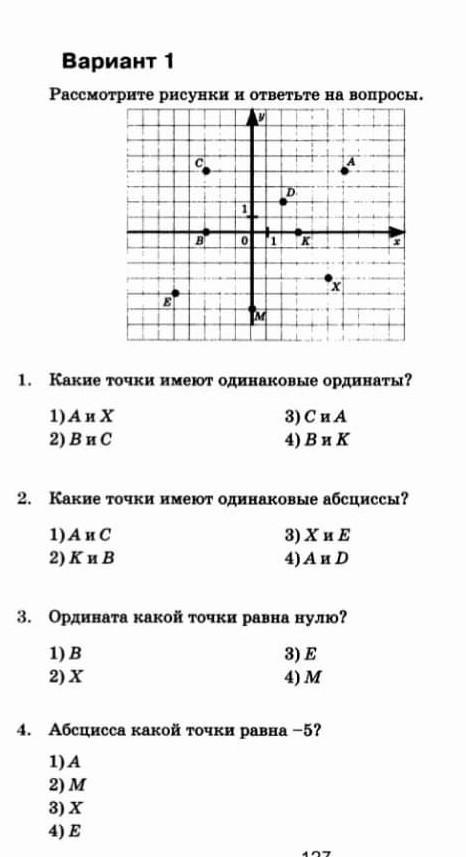 1) Одинаковые ординаты имеют точки, которые расположены на одной прямой, параллельной оси Ох или перпендикулярной оси Оу. На рисунке красная прямая