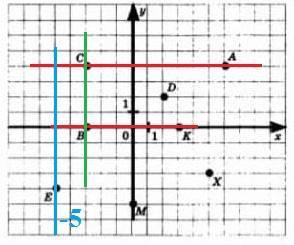 4) Абсцисса точки равна -5, если точка лечит на прямой, перпендикулярной оси Ох и пересекающей точку (-5;0). На рисунке синяя прямая