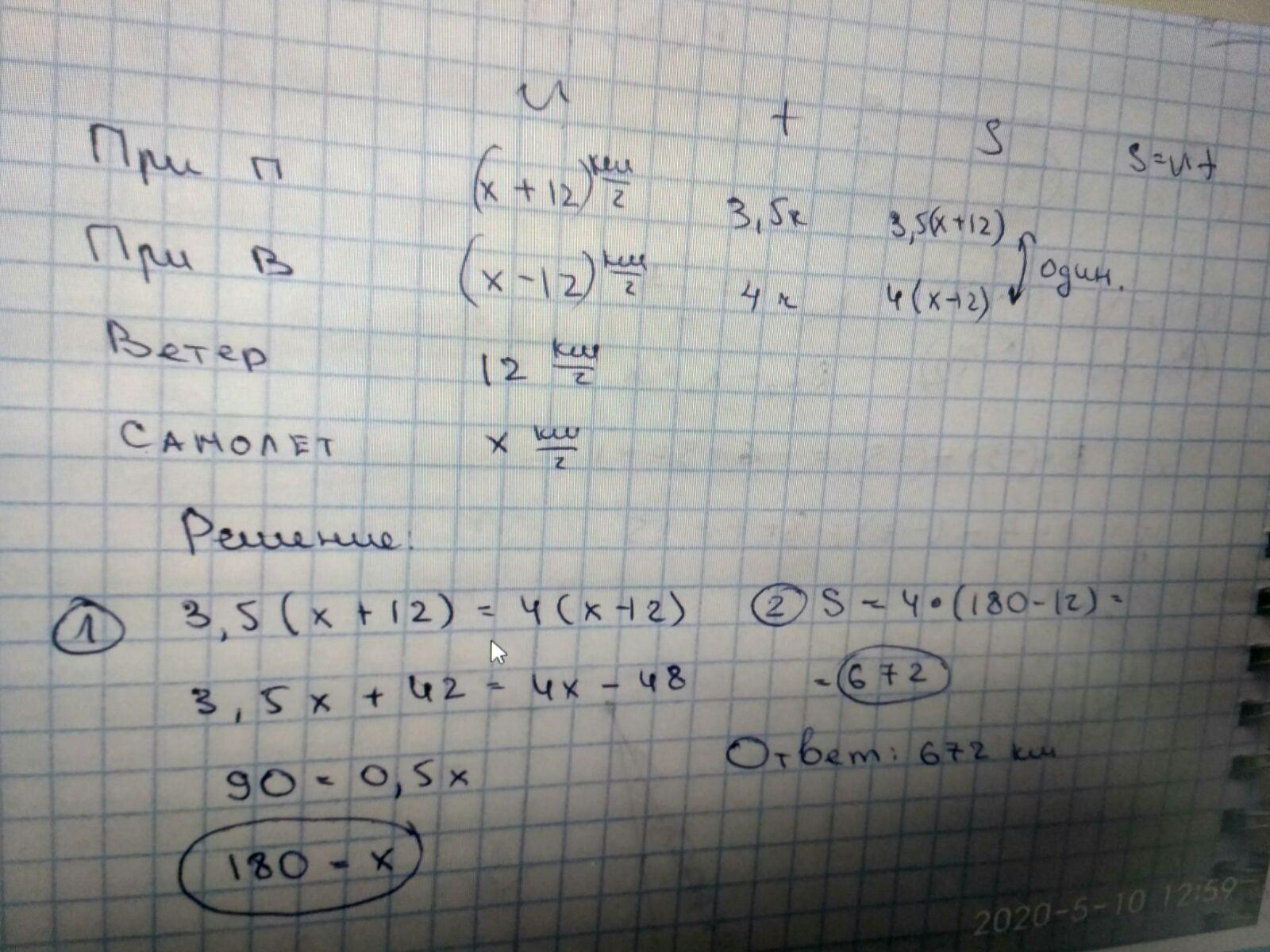Аэроплан пролетел между двумя городами при попутном ветре за 3,5 часа, а при встречном за 4 часа. Какое расстояние между городами если скорость ветра 12 км/ч.