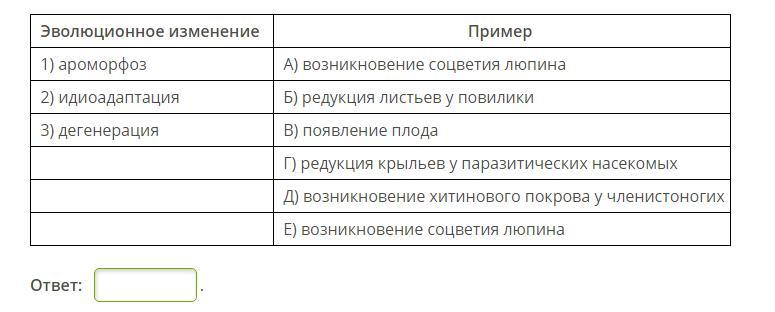 Установи соответствие между эволюционными изменениями и их примерами. (Ответ запиши в виде сочетания цифр и букв. Буквы записывай в алфавитном порядке. Пример: 1АБ2ВЕ3ГД.)