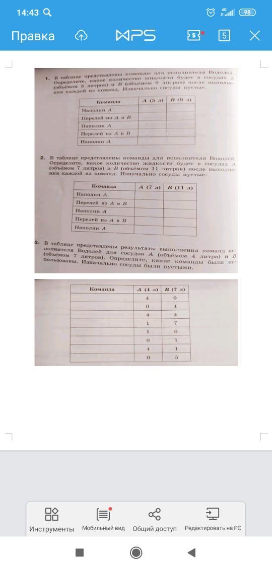 Помогите пожалуйста! Задание по ИКТ в таблице представлены команды для исполнителя водолей определите какое количество жидкости будет в сосудах A (объёмом 5 литров) и B (объёмом 9 литров)после выполнения каждой из команд. ианочально сосуды пустыне ответа