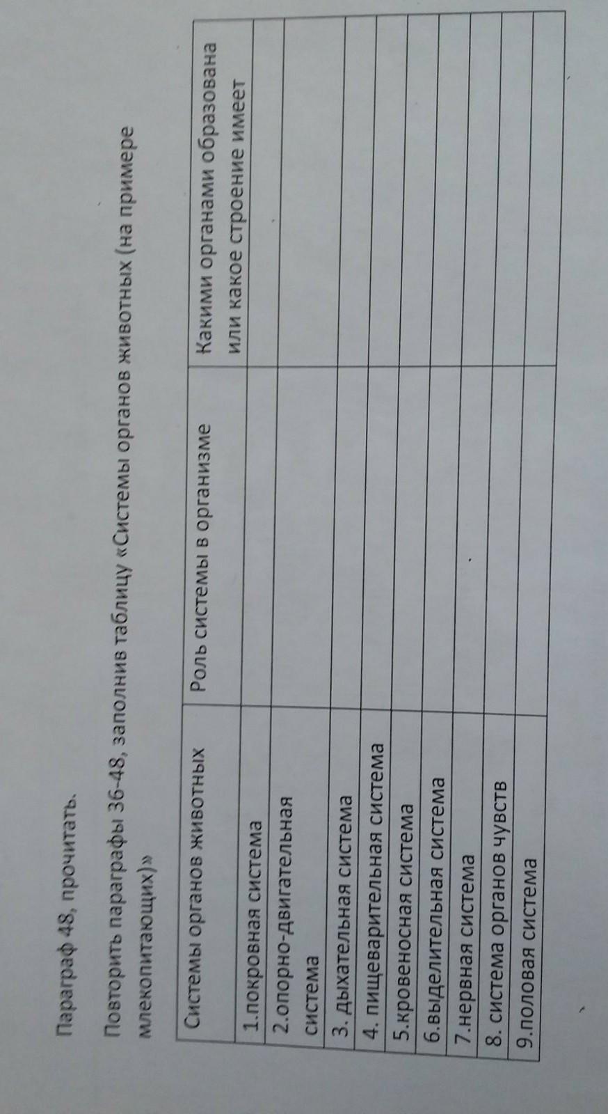 Повторить параграфы 36-48, заполнив таблицу «Системы органов животных (на примере