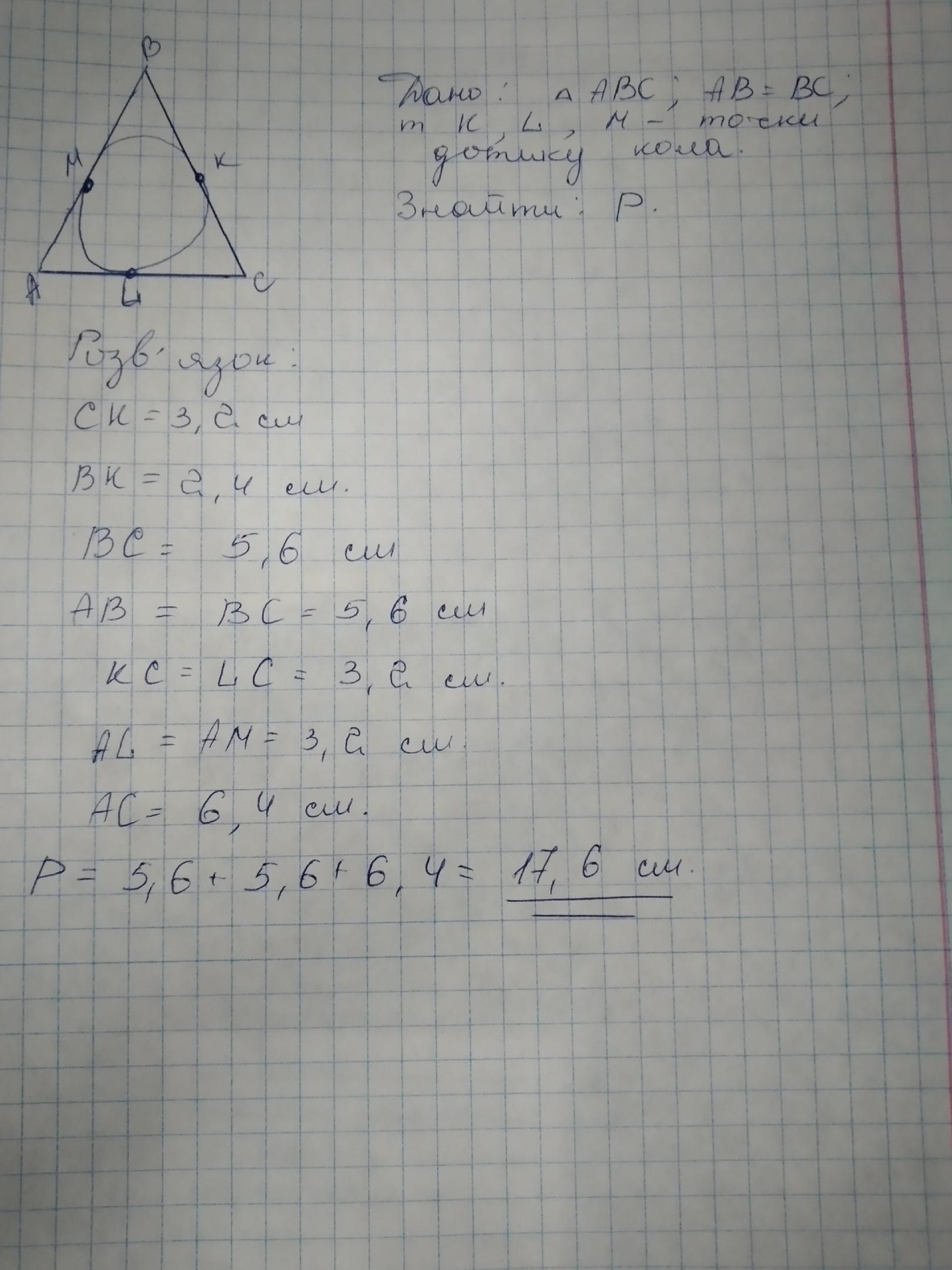 Коло, вписане у рівнобедрений трикутник, ділить його бічну сторону на відрізки 2,4 см і 3,2 см, починаючи від основи. Знайти периметр трикутника.