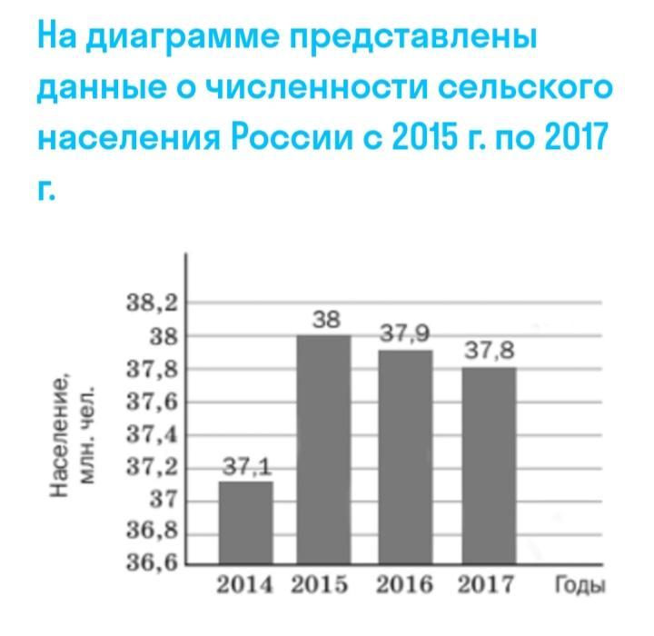 Используйте данные диаграммы, определите, на сколько миллионов человек понизилась численность сельского населения России с 2015 по 2017 г.