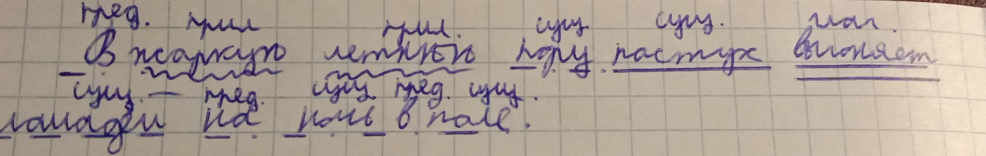 В (предлог) жаркую(прилагательное) летнюю(прилагательное) пору(существительное) пастух(существительное, подлежащее ____) выгоняет(глагол, сказуемое ====) лошадей(существительное) на(предлог) ночь(существительное) в(предлог) поле(существительное)