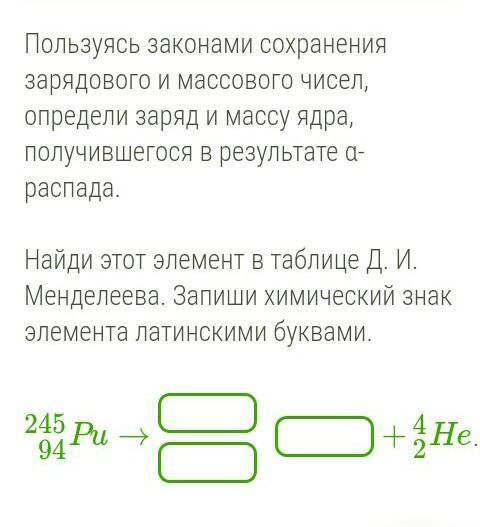 Пользуясь законами сохранения зарядового и массового чисел, определи заряд и массу ядра, получившегося в результате α-распада.