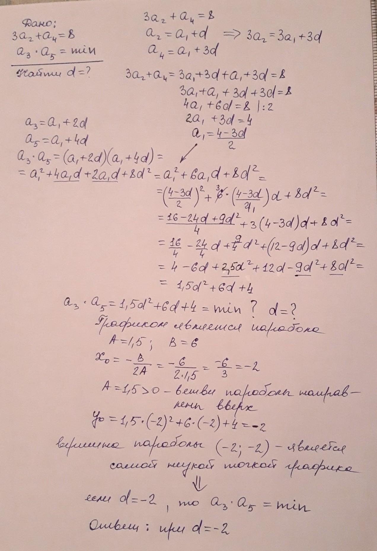 Сумма утроенного второго и четвёртого членов арифметической прогрессии равна 8. Определи, при каком значении разности прогрессии произведение третьего и пятого членов прогрессии будет наименьшим. Ответ: разность прогрессии: = . В решении задания использовались формулы (запиши недостающие числа): 1. 1=−; 2. ()=++2