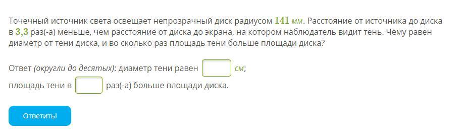 Точечный источник света освещает непрозрачный диск радиусом 141 мм. Расстояние от источника до диска в 3,3 раз(-а) меньше, чем расстояние от диска до экрана, на котором наблюдатель видит тень. Чему равен диаметр от тени диска, и во сколько раз площадь тени больше площади диска?