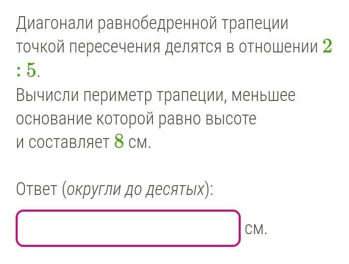 Диагонали равнобедренной трапеции точкой пересечения делятся в отношении 2 : 5.