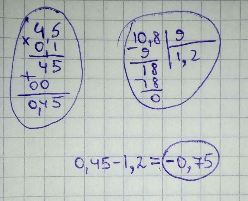 1) 4.5×0.1 - 1.08 : 0.9 = - 0.75