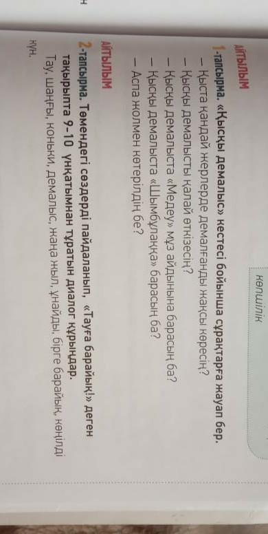 1.Қыста мен тауда демалғанды жақсы көремін.Қысқы демалыста көптеген ойындар ойнап,отбасыммен өткіздім.Медеу мұз айдынына,Шымбұлаққа бардым.Аспа жолмен көтерілдім.