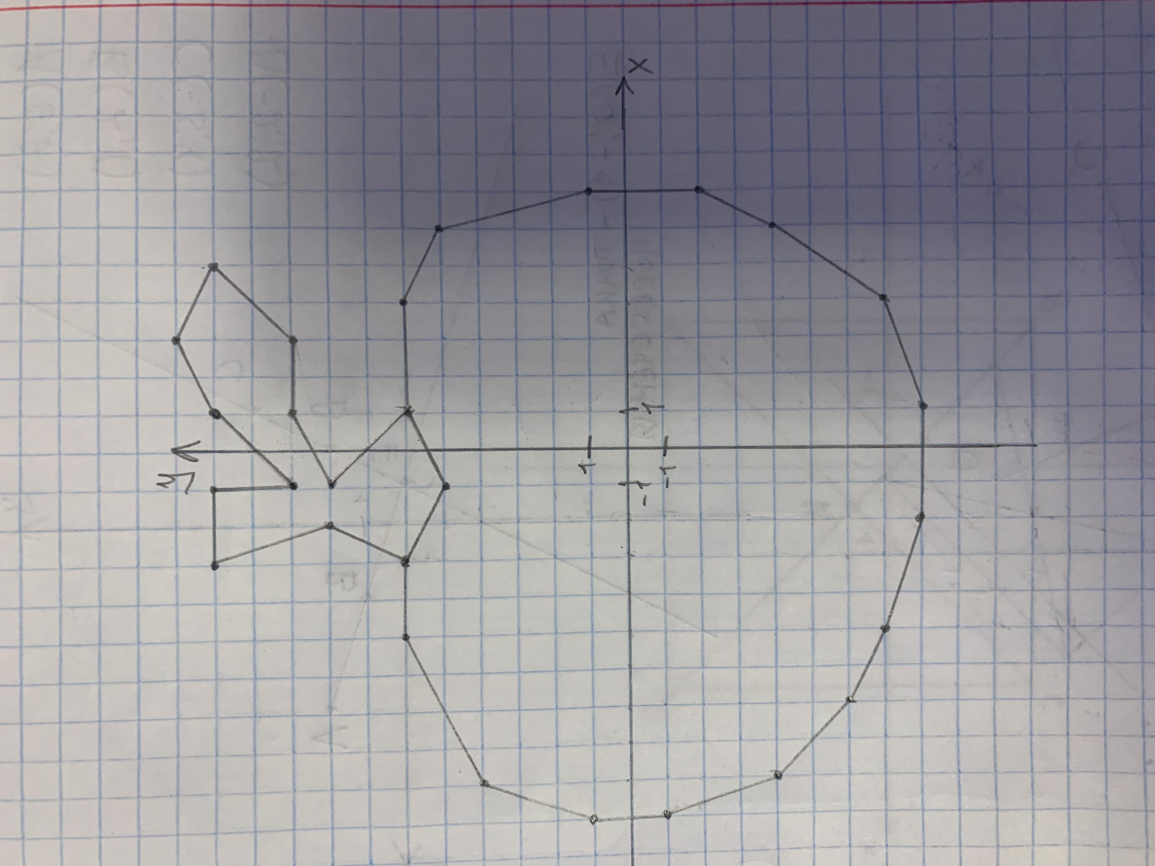 Часть 2: (-3,6), (-2,8), (-3,11), (-1,11), (-1,9), (1,11), (3,12),(5,11),(3, 9), (1,9),