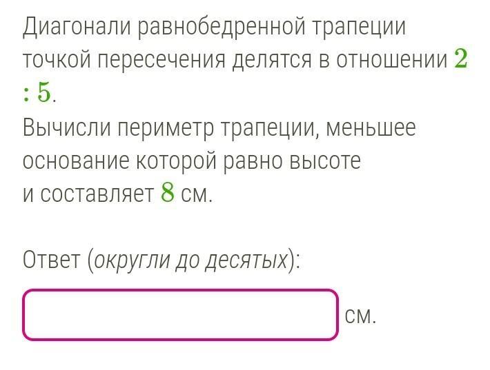 Вычисли периметр трапеции, меньшее основание которой равно высоте и составляет 8 см.