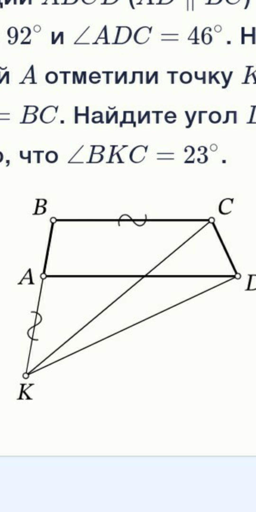 В трапеции ABCD (AD | BC) ZABC = 92° и ZADC 46°. На луче ВА за точкой А отметили точку К такую, что AK = ВС. Найдите угол DKC, если известно, что 23°. СРОЧНО НУЖНО СДЕЛАТЬ