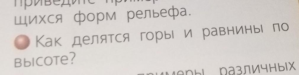 Відповідь:Горы по высоте делятся на три группы: низкие, средние и высокие. Низкие горы - высота до 1000 метров. ... Высокие - выше 2000 метров. Равнины тоже делятся на три группы: низменности, возвышенности и плоскогорья.