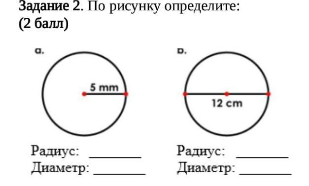 а. радиус: 5 мм диаметр:10мм, 1 см в. радиус: 6 см диаметр: 12 см