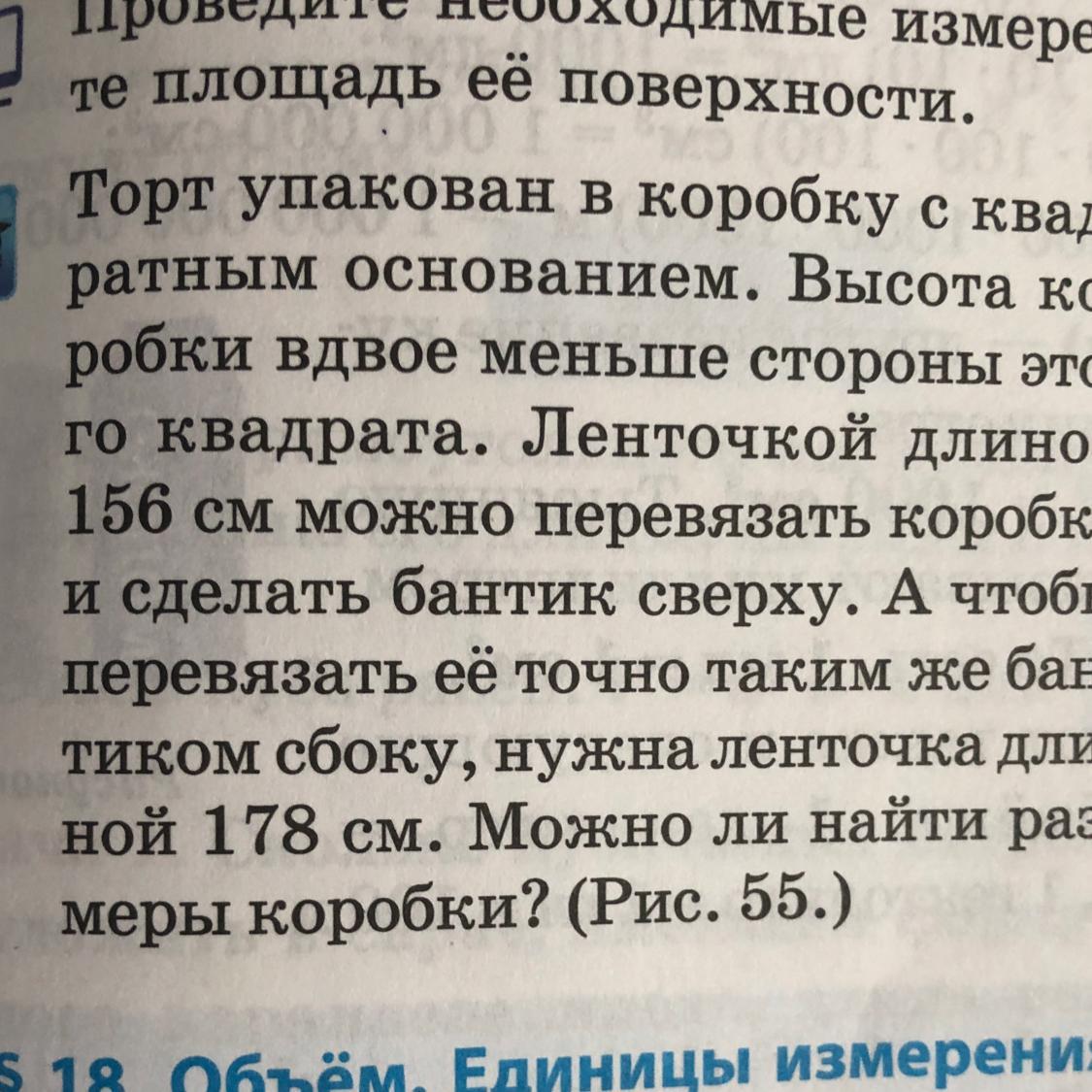 Торт упакован в коробку с квадратным основанием. Высота коробки вдвое меньше стороны этого квадрата. Ленточка длинной 156см можно перевязать коробку и сделать бантик сверху. А чтобы перевязать её точно таким же бантом сбоку нужна ленточка длинной 178см. Можно ли найти размеры коробки?