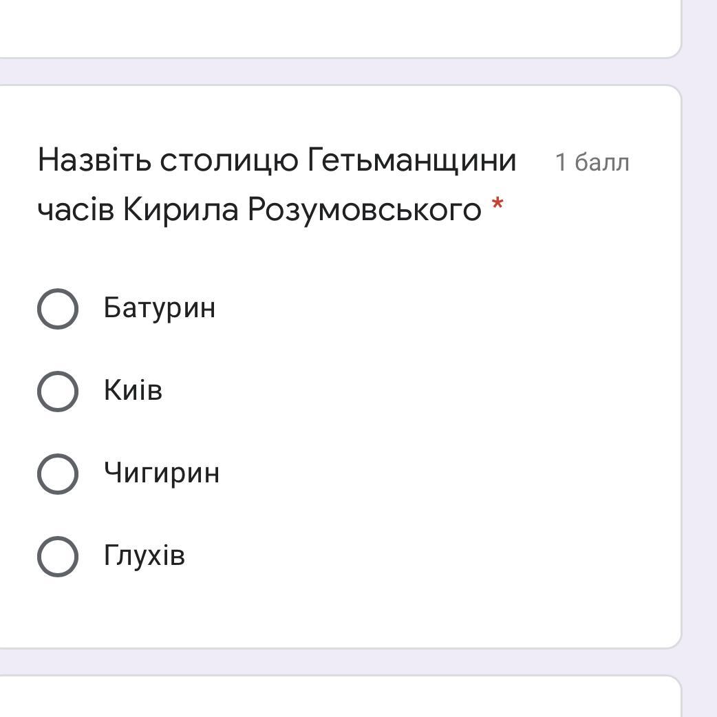 Назвіть столицю Гетьманщини часів Кирила Розумовського *
