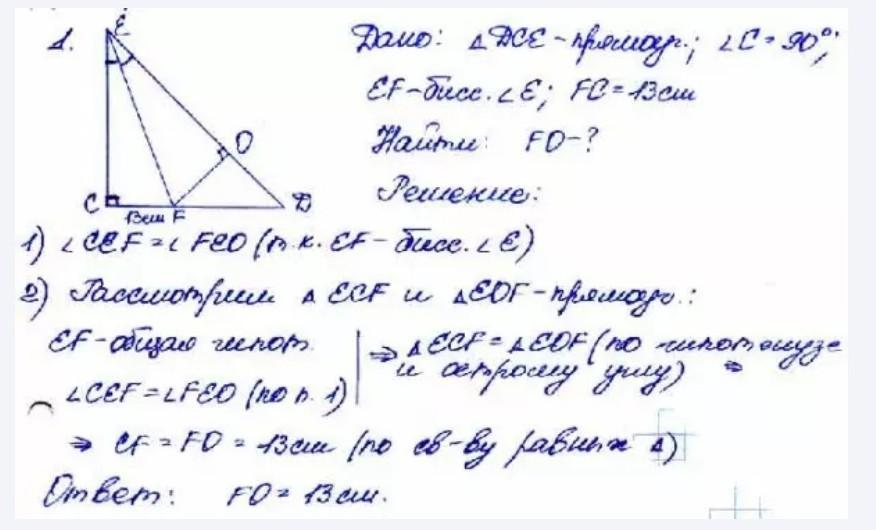 В прямоугольном треугольнике DCE с прямым углом С проведена биссектриса EF? причем EF=13 см. Найдите расстояние от точки F до прямой DE.