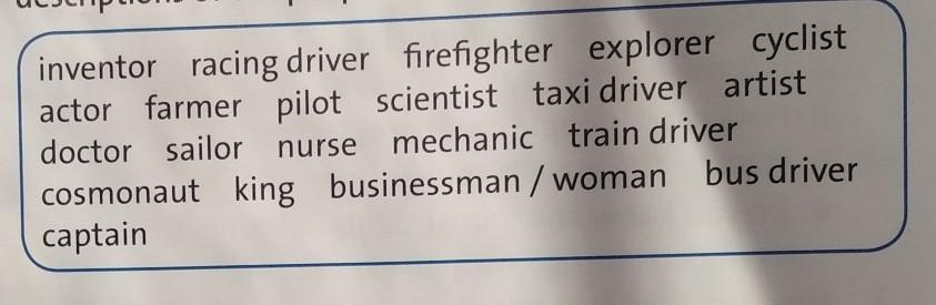 изобретатель, автогонщик, пожарный, исследователь, велосипедист, актер, фермер, пилот, ученый, таксист, художник, врач, моряк, медсестра, механик, машинист поезда, космонавт, король, бизнесмен / бизнесвумен ,водитель автобуса, капитан