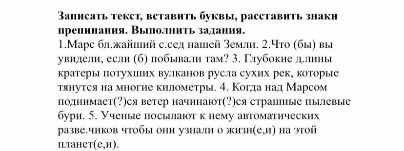 1. Марс - ближайший сосед нашей Земли. 2. Что бы вы увидели, если б побывали там? 3. Глубокие долины, кратеры потухших вулканов, русла сухих рек, которые тянутся на многие километры. 4. Когда над Марсом поднимаются ветры, начинаются страшные пылевые бури. 5. Ученые посылают к нему автоматических разведчиков, чтобы они узнали о жизни на этой планете.