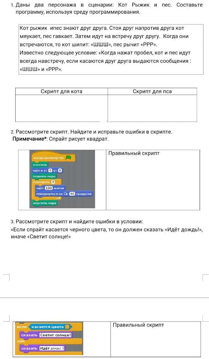 1.Ответ Скрипт для кота: когда будет нажат флажок: Всегда: Всегда если: нажато пробел то: идти 10 шагов: Всегда если: дотронулось цвета пса: говорить (шшшшш!).