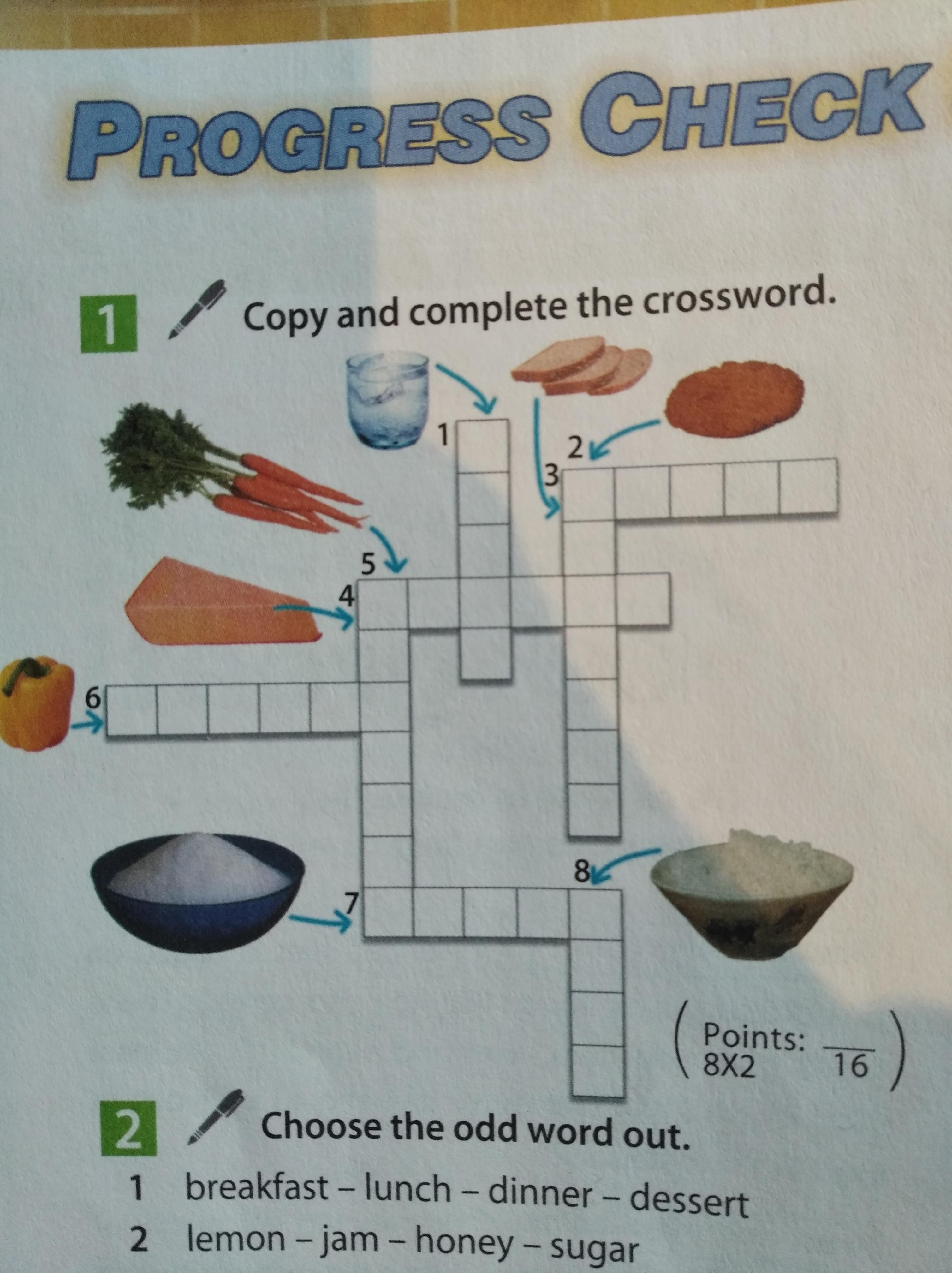 1. water 2. biscuit 3. bread 4. cheese 5. carrots 6. pepper 7. sugar 8. rice