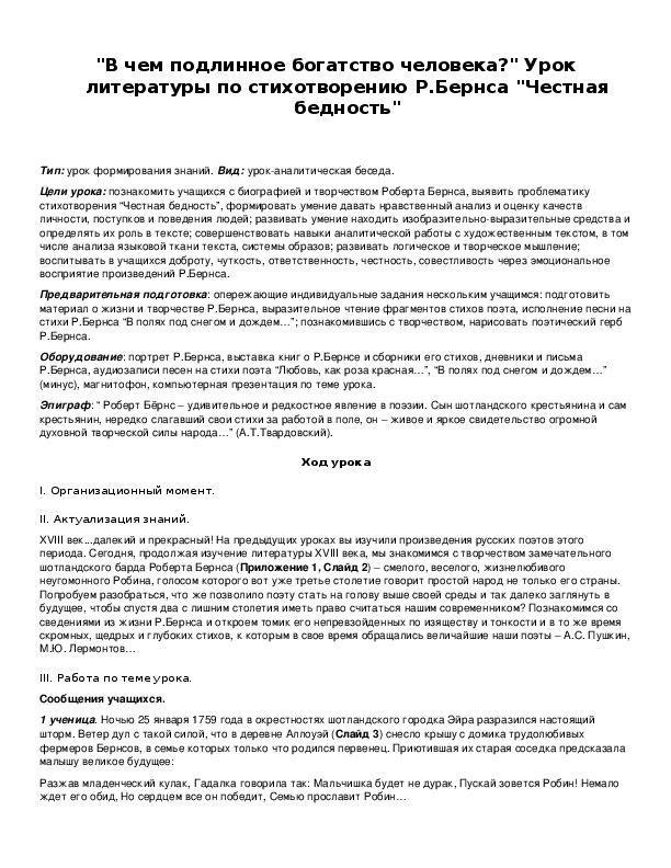 ПОМОГИТЕ, СРОЧНО НУЖНО, ДАМ 100 БАЛЛОВ Р. Бернс «Честная бедность». ответ на вопрос В чем подлинное богатство человека?