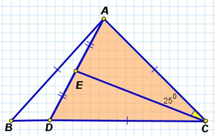 Биссектриса треугольника АДС АЕ делит угол по полам угол она равна 25 градусов значит треугольник АДС равна 25*2=50 градусов Угол АВД равна 50 градусов так как треугольник АВС равнобедренный а углы АВД и АСД боковые углы и они равны