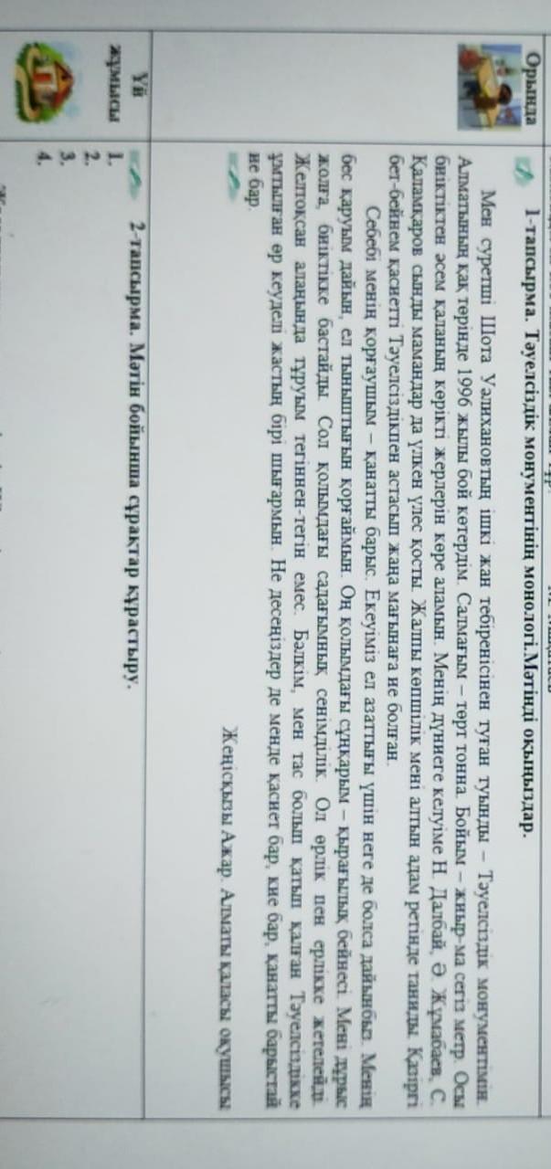 4) (полный ответ) Менім дүниеге келгеніме Н. Далбай, Ә. Жұмабаев, С. Қаламқаров үлес қосты. (краткий ответ) Н. Далбай, Ә. Жұмабаев, С. Қаламқаров.