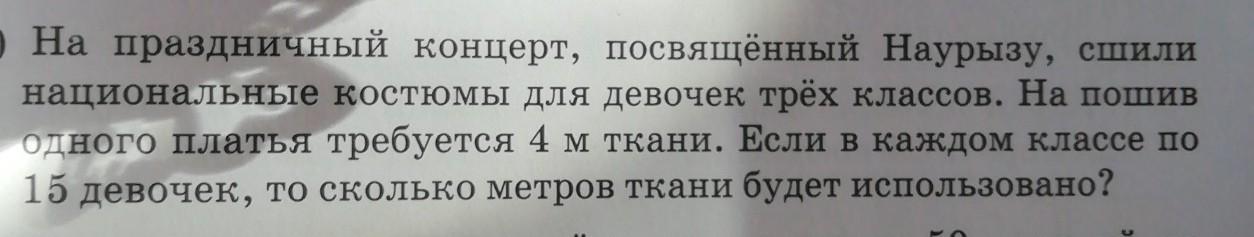 Сначала мы узнаём сколько метров ткани понадобится на один класс 15×4=60м.