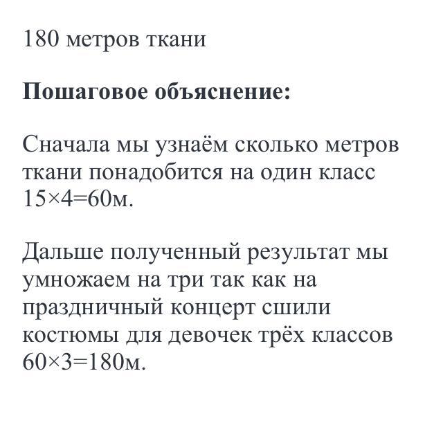 Дальше полученный результат мы умножаем на три так как на праздничный концерт сшили костюмы для девочек трёх классов 60×3=180м.