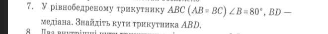 Объяснение: Высота, Медиана или Бис-са проведенная из вершины равнобедренного треугольника являеться Высотой, Медианой и Бис-сой одновременно. Поэтому Угол В - 80/2=40, Угол D - это высота, значит 90, Угол А находиться так - 180-(90+40)=50.