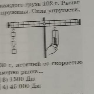 к рычагу подвешены три груза.масса каждого груза 102 г.рычаг удерживается в равновесии с помощью пружины.сила упругости возникшая в пружине в равновесии...