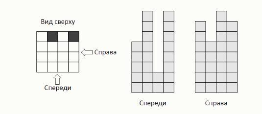 Никита взял доску 4×4 и на каждую клетку поставил столбик из кубиков. На две клетки по 1 кубику, на две клетки по 2 кубика, на две клетки по 3 кубика, …, на две клетки по 8 кубиков. Потом он нарисовал, как выглядит конструкция спереди и справа (если перед столбиком из 8 кубиков стоит столбик из 5, то Никита нарисует столбик из 8 кубиков). Сколько в сумме кубиков он поставил на 2 выделенные клетки?