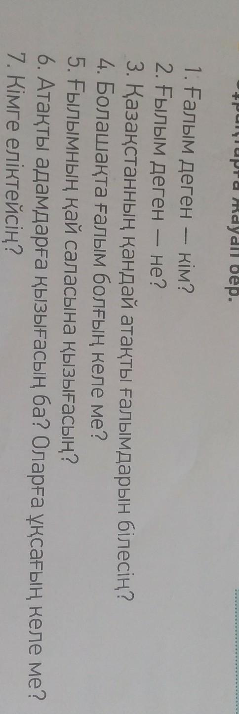 Кто знает хорошо казахский мне нужна помощь !!!1)Ғылым деген кім ?2)Ғылым деген не ? 3)Атақты адамдарға қазығасың ба ?Оларға ұқсағың келе ме ?